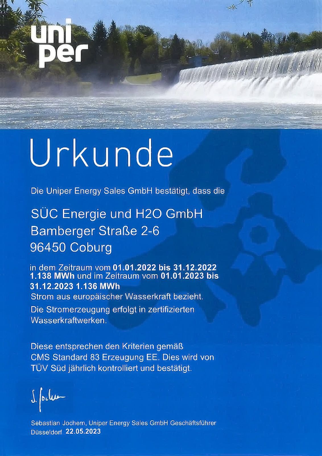 SÜC ENERGIE, UNIPER - BESTÄTIGUNG ÜBER DIE VERWENDUNG ERNEUERBARER ENERGIEN